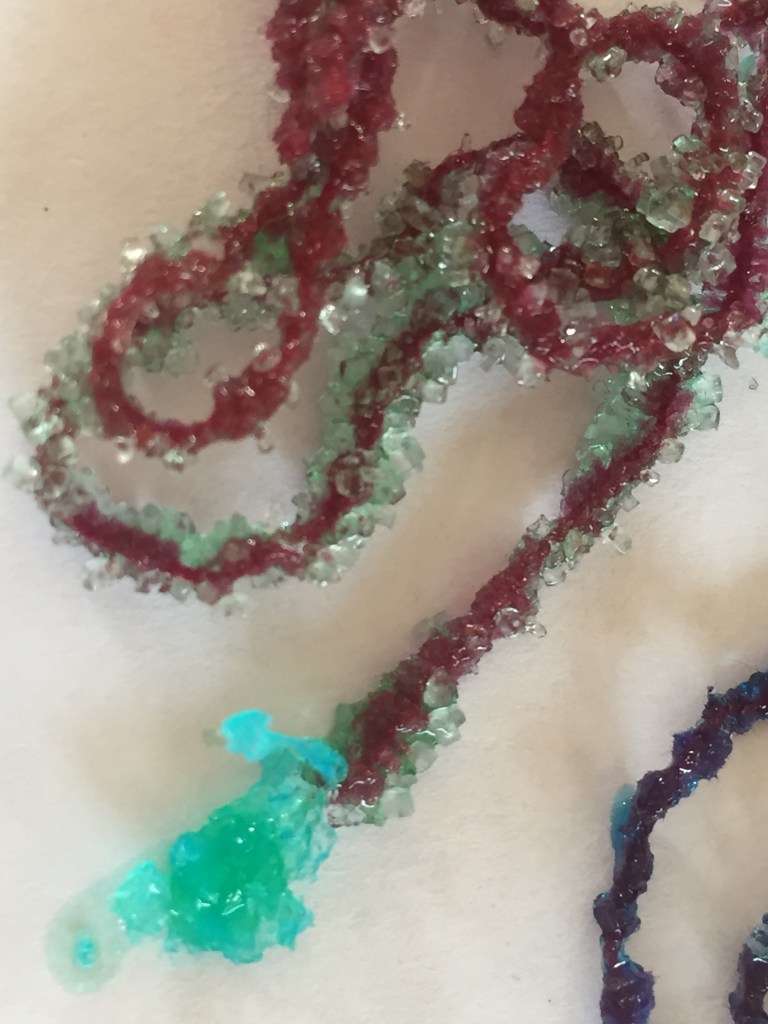 Ընթացքը՝ ջրի մեջ լցնում ենք աղ և խառնում, աղը ջրում լուծվելուց հետո, նորից ենք ավելացնում՝ այնքան քանակությամբ, որ այլևս չլուծվի։մետաղալարից փոքրիկ պատկերներ ենք պատրաստում և իջեցնում լուծույթի մեջ։ Ամեն օր հետևում և գրանցում ենք կատարված փոփոխությունները։ Որպեսզի բյուրեղիկները գունավոր լինեն, կարող ենք ավելացնել նաև կերակրի ներկեր։
